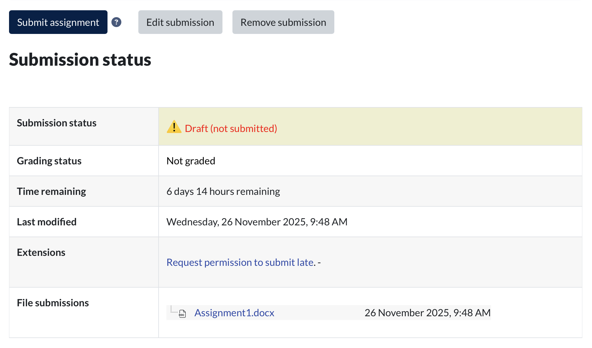 Your assignment is now on the system but in draft form only. At this stage, you can still edit your work if required.