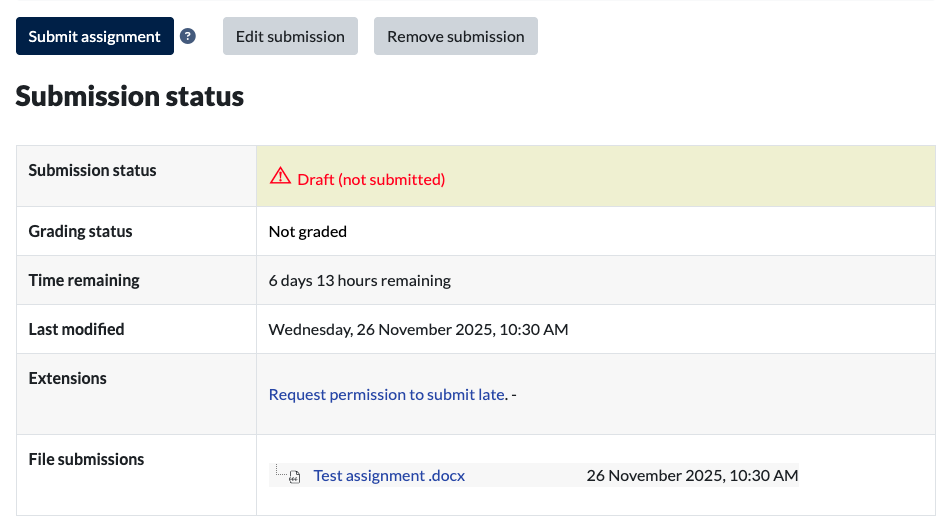 You have now uploaded your assignment but it is not yet submitted for marking. Uploaded files will be kept in ‘draft’ mode until you are ready to send it to be marked. Notice the Draft (not submitted) message in the Submission status bar in the image below.