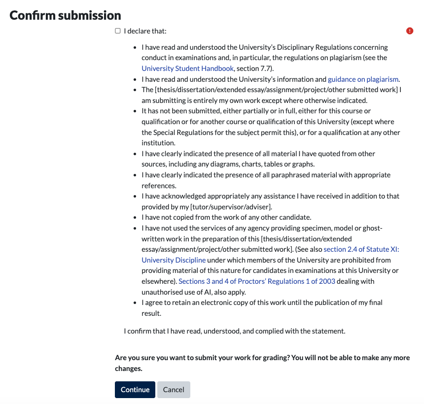 • Underneath the authorship declaration you will be reminded ‘Are you sure you want to submit your work for grading? You will not be able to make any more changes.’ This is the last point at which you can make any changes to your assignment. If you are sure everything is in order, click Continue; otherwise click Cancel to be returned to the previous page.