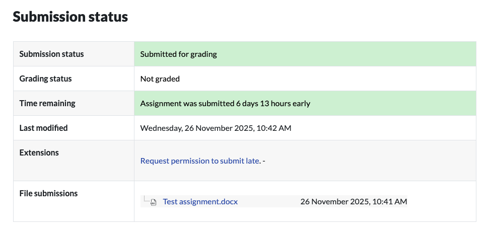 When you have successfully submitted your file for marking, the ‘Submission status’ heading on the assignment submission page will display the text ‘Submitted for grading’. You will also receive an email confirmation. The submission date and time will appear next to the field ‘Last modified’.